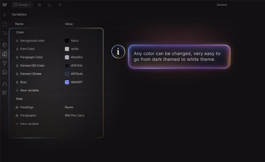 Under the Variables tab, you'll find all the colors used in the template, allowing you to easily customize them to suit your needs.